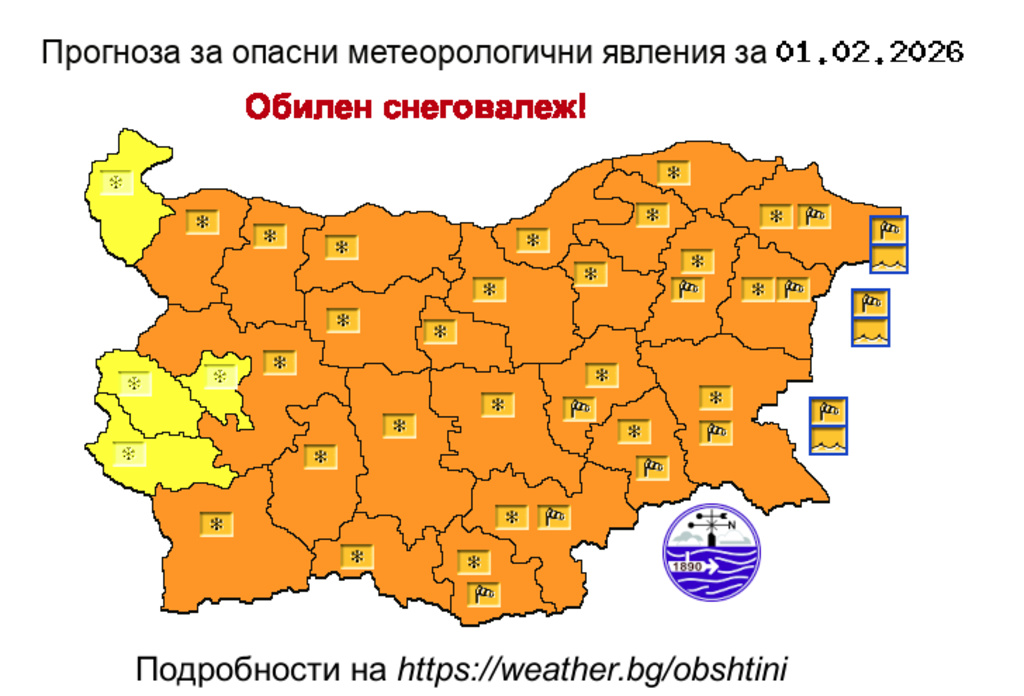 Оранжев код за обилен снеговалеж издаде за днес Националният институт по метеорология и хидрология. Предупреждението важи за 24 области. За останалите четири в сила е жълт код за сняг, а за някои източни и южни области има и код за силен вятър (виж графиката по-долу).