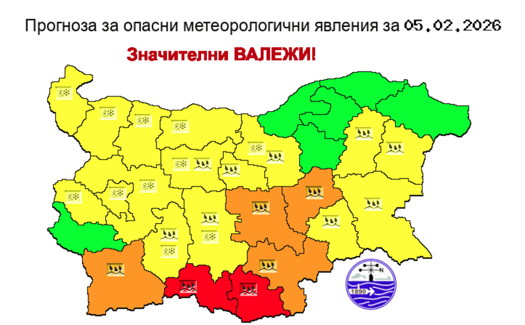 Червен предупредителен код за значителни валежи издаде за днес Националният институт по метеорология и хидрология за областите Смолян и Кърджали. За четири други области кодът за дъжд е оранжев (Стара Загора, Сливен, Хасково и Благоевград), а за много други е в сила жълт код за дъжд, сняг и поледици (виж графиката по-долу).
