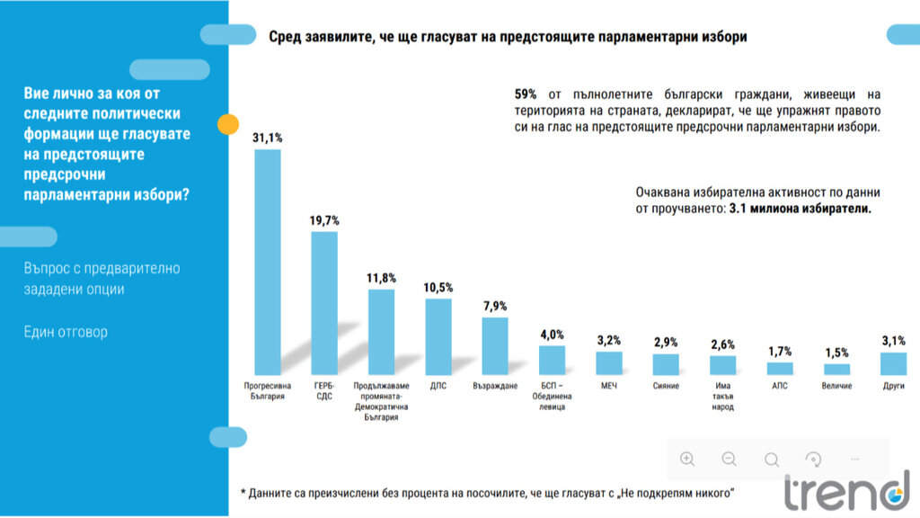 „Прогресивна България“ остава лидер в подредбата с 31,1% подкрепа сред заявяващите, че ще гласуват на предстоящите избори. Втора е ГЕРБ с 19,7%, а на трета позиция са ПП-ДБ с 11,8%. Плътно зад тях стои ДПС с 10,5%, а „Възраждане“ е на пета позиция с 7,9%. БСП-ОЛ остава точно на ръба на парламентарната бариера с 4% подкрепа сред гласуващите.